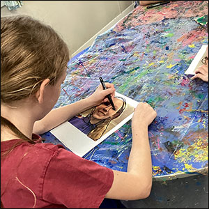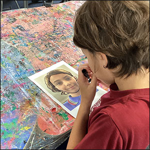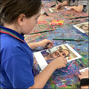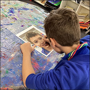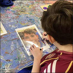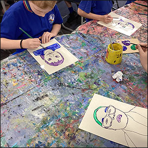 Pop Art: Year 5 and 6 students were inspired by the iconic Pop Art style of Andy Warhol. After taking selfies, they traced their portraits onto acetate and painted their key facial features in vibrant cool or warm tones, pairing them with contrasting backgrounds.