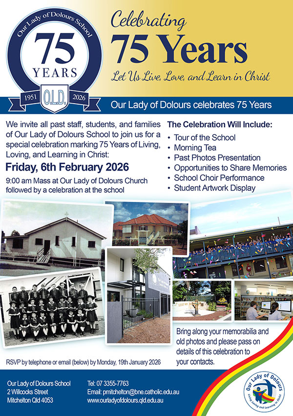In 2026 the OLD Community will celebrate 75 years of Our Lady of the Rosary School which opened its doors to students in 1951. We invite all past staff, students and families to join us for a special celebration on Friday 6 February, 2026 at the school. RSVP by Monday 19 January, 2026 by email: pmitchelton@bne.catholic.edu.au OR phone 3355 7763